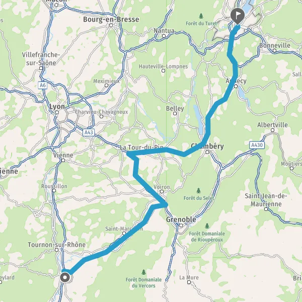 Prendre à droite et rejoindre A43 E70. Continuer sur 47 kilomètres