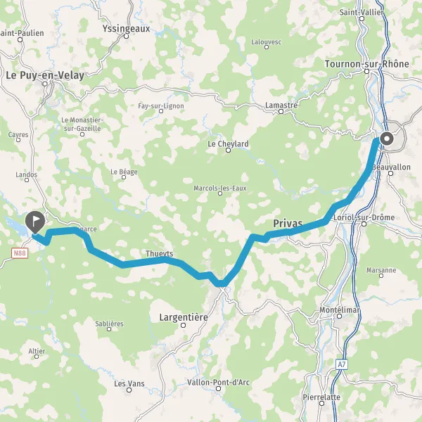 Tourner légèrement à gauche sur N102 (Route du Puy-en-Velay) et continuer sur 15 kilomètres
