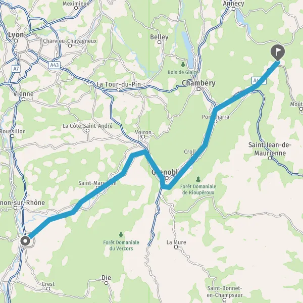 Prendre à droite et rejoindre A43 E70. Continuer sur 19 kilomètres