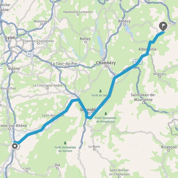 Prendre à droite et rejoindre A43 E70. Continuer sur 19 kilomètres