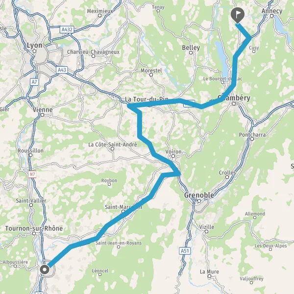 Prendre à droite et rejoindre A43 E70. Continuer sur 47 kilomètres
