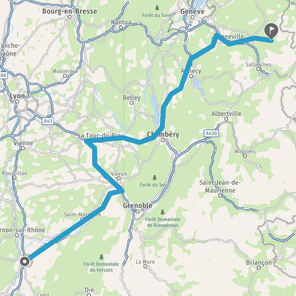 Prendre à droite et rejoindre A43 E70. Continuer sur 47 kilomètres