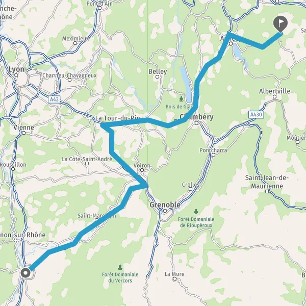 Prendre à droite et rejoindre A43 E70. Continuer sur 47 kilomètres