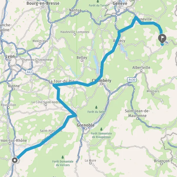Prendre à droite et rejoindre A43 E70. Continuer sur 47 kilomètres