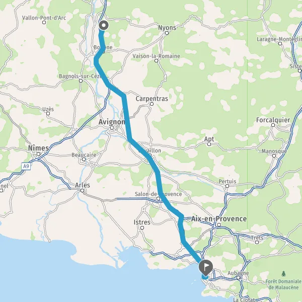 Avec le mode voiture, vous pouvez configurer vos options (type de véhicule, autoroute ou non, péage ou non, distance la plus courte), tout en ayant accès aux infos de circulation grâce à notre service d'info-trafic en temps réel. Ainsi faites des économies sur le coût ou la durée de votre voyage, en trouvant le trajet La Garde-Adhémar Marseille adapté à vos besoins.