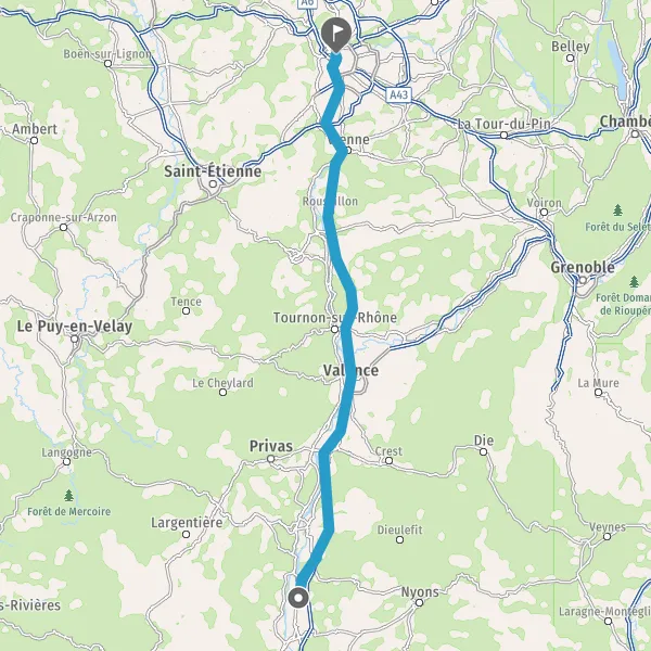 Avec le mode voiture, vous pouvez configurer vos options (type de véhicule, autoroute ou non, péage ou non, distance la plus courte), tout en ayant accès aux infos de circulation grâce à notre service d'info-trafic en temps réel. Ainsi faites des économies sur le coût ou la durée de votre voyage, en trouvant le trajet Pierrelatte Lyon adapté à vos besoins.