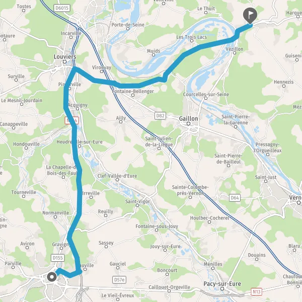 Au rond-point, prendre la 3ème sortie sur D155 (Route de Louviers) et continuer sur 2,5 kilomètres