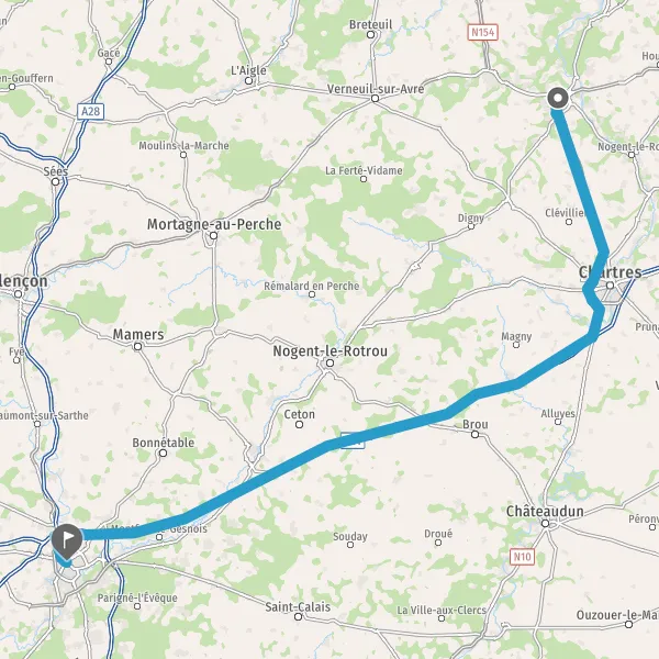 Prendre à droite et rejoindre N154 (Route de Chartres). Continuer sur 27 kilomètres