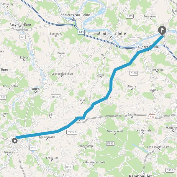 Au rond-point, prendre la 2ème sortie sur D45 (Route de Tacoignières) et continuer sur 1,7 kilomètre