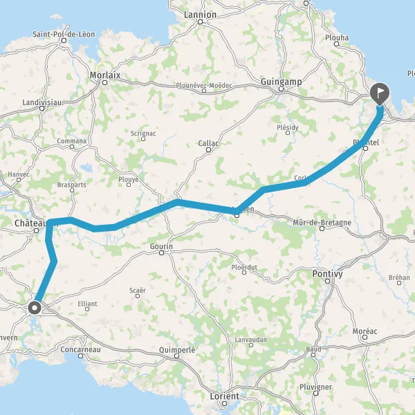 Au rond-point, prendre la 2ème sortie sur D15 (Avenue de Pen Carn Lestonan) et continuer sur 15 kilomètres