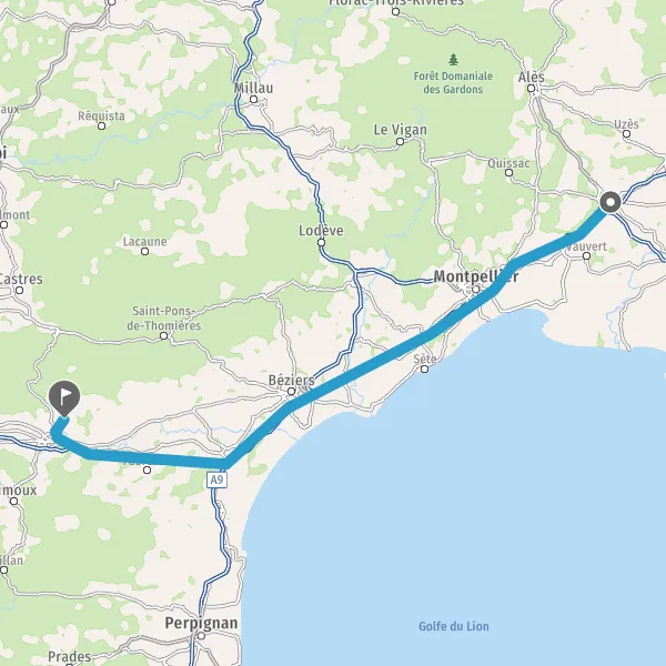 Prendre à droite et rejoindre A9 E15 E80. Continuer sur 32 kilomètres
