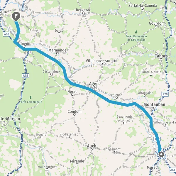Prendre à droite et rejoindre A62. Continuer sur 33 kilomètres
