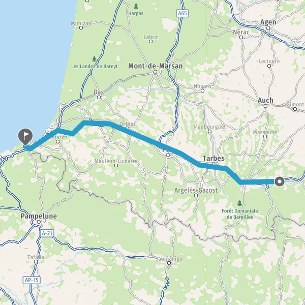 Tourner légèrement à droite sur A63 E5 E70 E80 et continuer sur 31 kilomètres