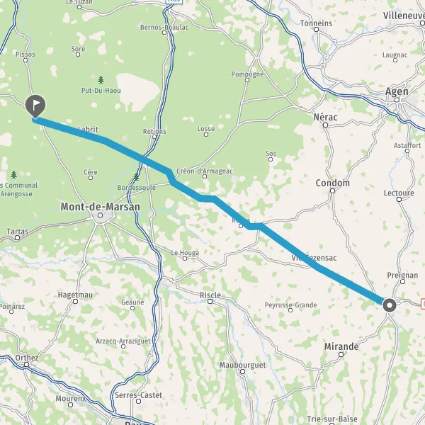 Au rond-point, prendre la 2ème sortie sur D626 (Avenue d'Albret) et continuer sur 18 kilomètres