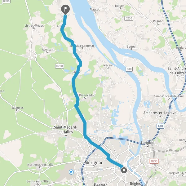 Au rond-point, prendre la 2ème sortie sur D208 (Route d'Arsac) et continuer sur 4,6 kilomètres