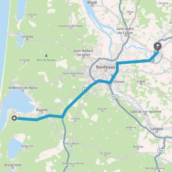 Prendre à gauche et rejoindre A63 E5 E70. Continuer sur 26 kilomètres