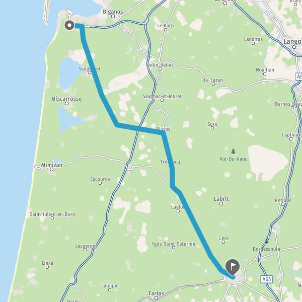 Au rond-point, prendre la 1ère sortie sur D652 (Route de Sanguinet) et continuer sur 6,8 kilomètres