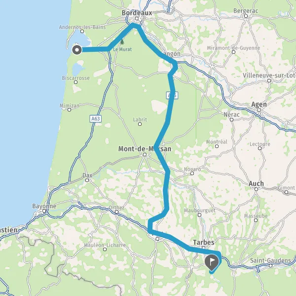 Prendre à gauche et rejoindre A63 E5 E70. Continuer sur 26 kilomètres