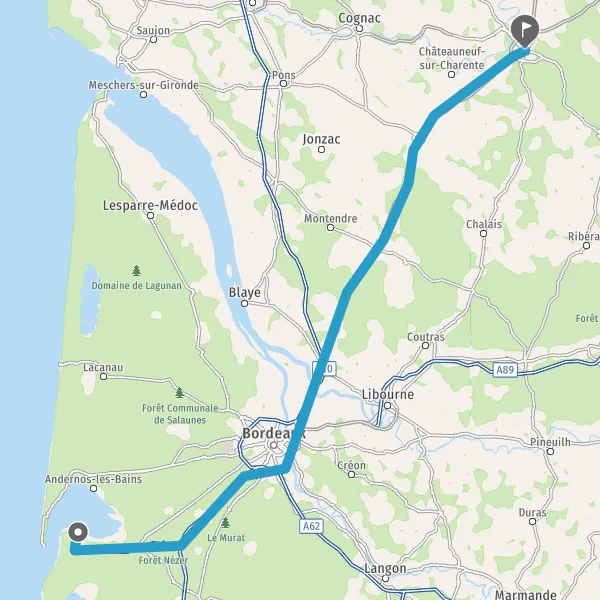 Prendre à gauche et rejoindre A63 E5 E70. Continuer sur 26 kilomètres