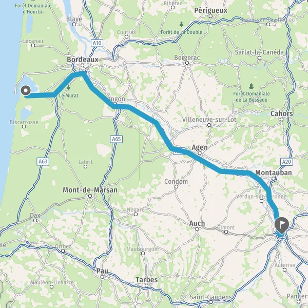 Prendre à gauche et rejoindre A63 E5 E70. Continuer sur 26 kilomètres