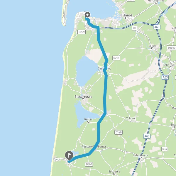 Tourner légèrement à droite sur D46 (Avenue de Parentis) et continuer sur 5,3 kilomètres
