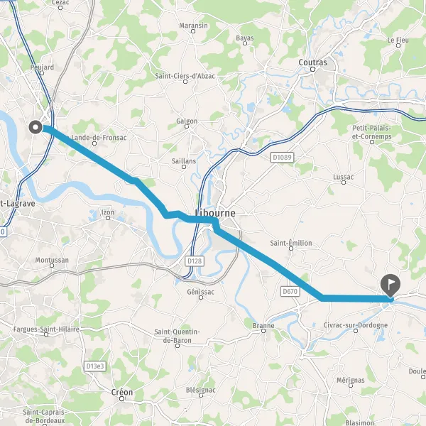 Au rond-point, prendre la 1ère sortie sur D670 (Route de Libourne) et continuer sur 3,6 kilomètres