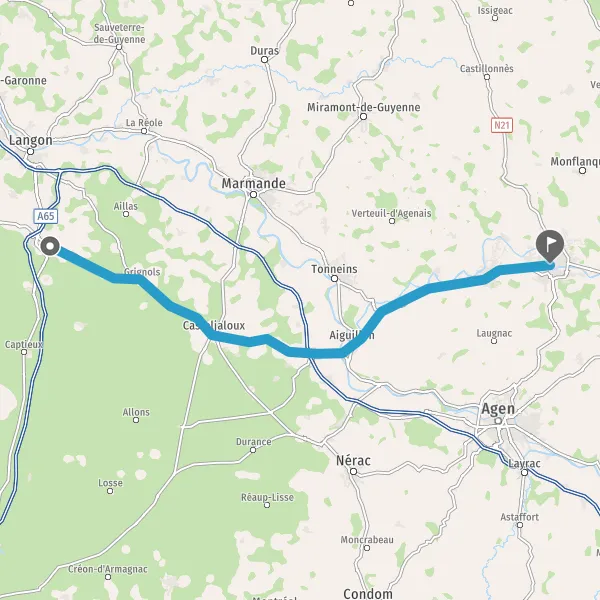 Au rond-point, prendre la 2ème sortie sur D655 (Route de Casteljaloux) et continuer sur 14 kilomètres