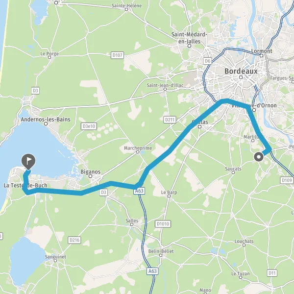 Au rond-point, prendre la 2ème sortie sur D211 (Route d'Arcachon) et continuer sur 9,6 kilomètres
