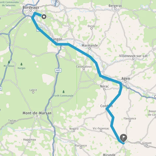 Au rond-point, prendre la 2ème sortie sur D655 (Route de Casteljaloux) et continuer sur 14 kilomètres