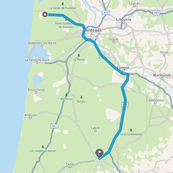 Prendre à droite et rejoindre A63 E5 E70. Continuer sur 30 kilomètres