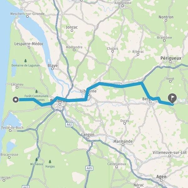 Prendre à droite et rejoindre D37 (Route de Bergerac). Continuer sur 250 mètres
