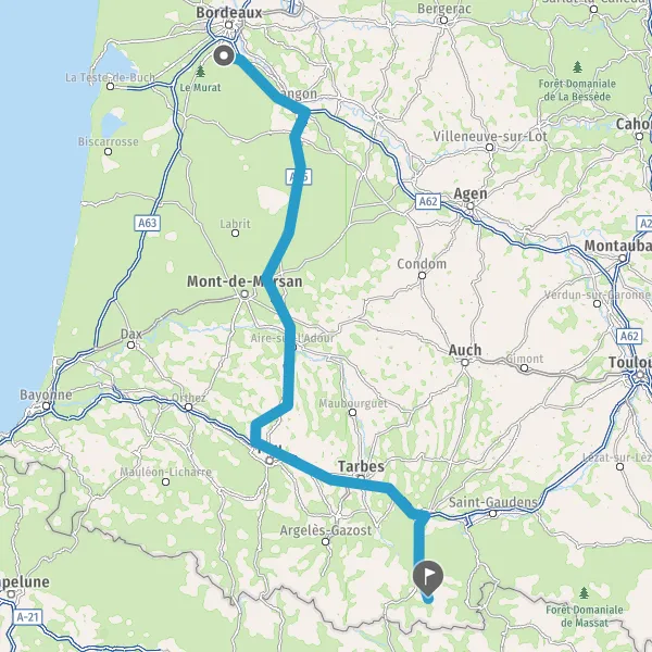 Prendre à droite et rejoindre A62 E72. Continuer sur 35 kilomètres