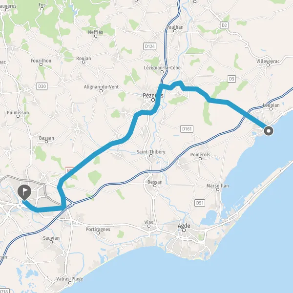 Au rond-point, prendre la 2ème sortie sur D613 (Route de Pézenas) et continuer sur 8,1 kilomètres