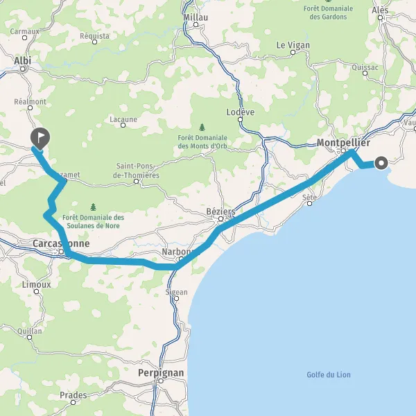 Au rond-point, prendre la 2ème sortie sur D118 (Avenue de la Montagne Noire) et continuer sur 36 kilomètres