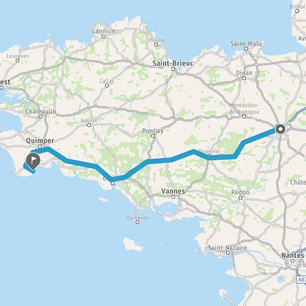 Au rond-point, prendre la 3ème sortie sur D785 (Route de Pluguffan) et continuer sur 14 kilomètres