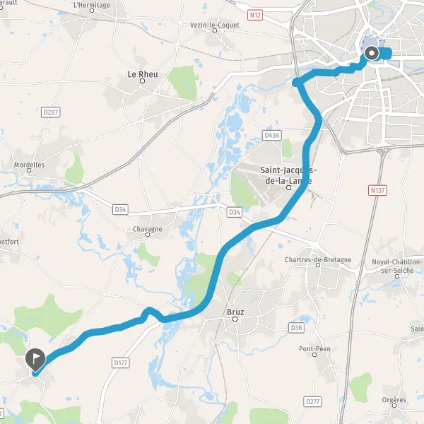 Prendre à gauche et rejoindre D44 (Rue de Bruz). Continuer sur 750 mètres