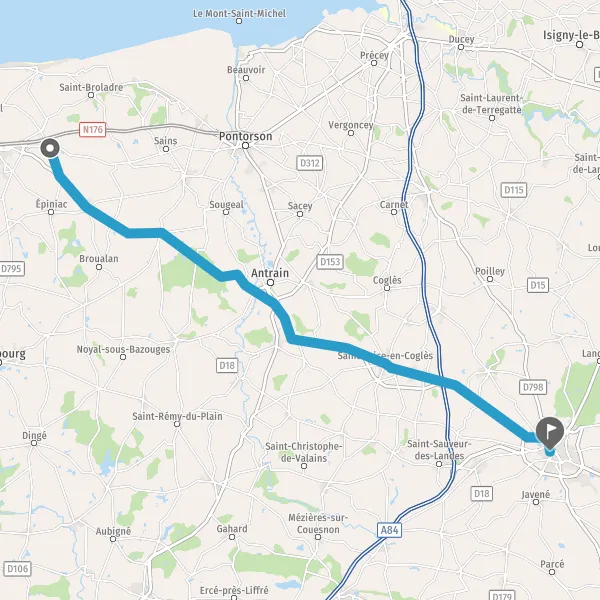 Tourner légèrement à gauche sur D155 (Rue de Fougères) et continuer sur 13 kilomètres