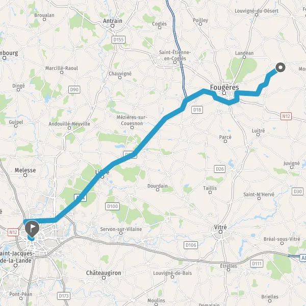 Au rond-point, prendre la 2ème sortie sur N12 (Route de Fougères) et continuer sur 2,3 kilomètres