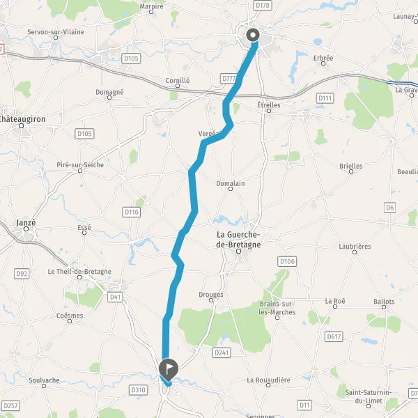 Au rond-point, prendre la 1ère sortie sur D108 (Rue de Domalain) et continuer sur 7,7 kilomètres