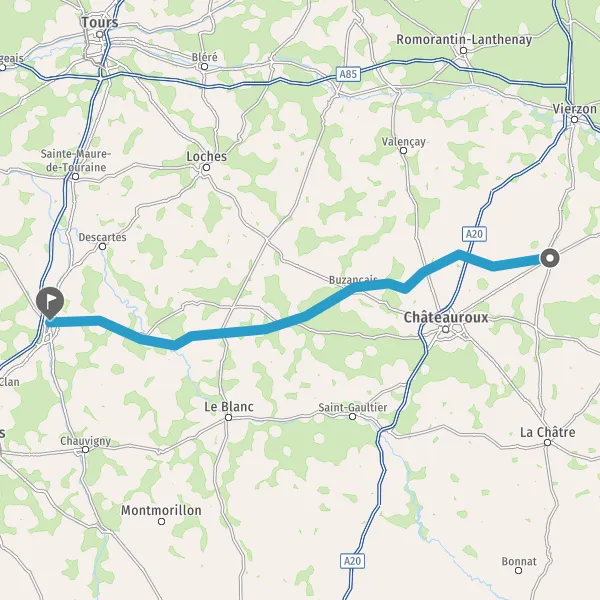 Tourner à droite sur D8 (Route de Levroux) et continuer sur 20 kilomètres