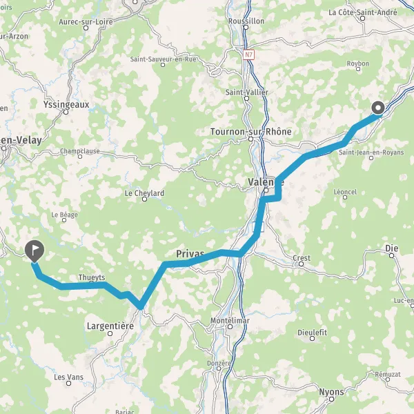 Tourner légèrement à gauche sur N102 (Route du Puy-en-Velay) et continuer sur 15 kilomètres