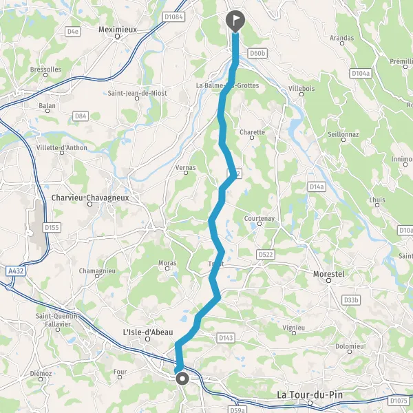 Au rond-point, prendre la 3ème sortie sur D18 (Place de la Bourbre) et continuer sur 170 mètres
