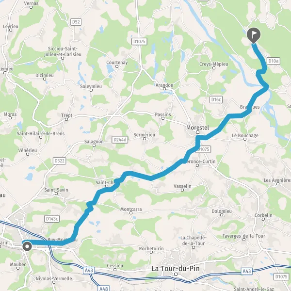 Au rond-point, prendre la 3ème sortie sur D16 (Route de Morestel) et continuer sur 600 mètres