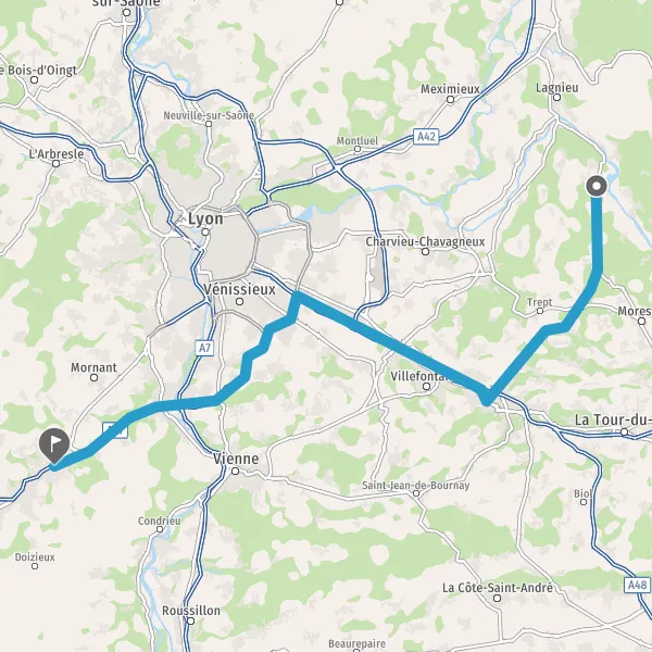 Prendre à gauche et rejoindre A46 E15 E70. Continuer sur 21 kilomètres