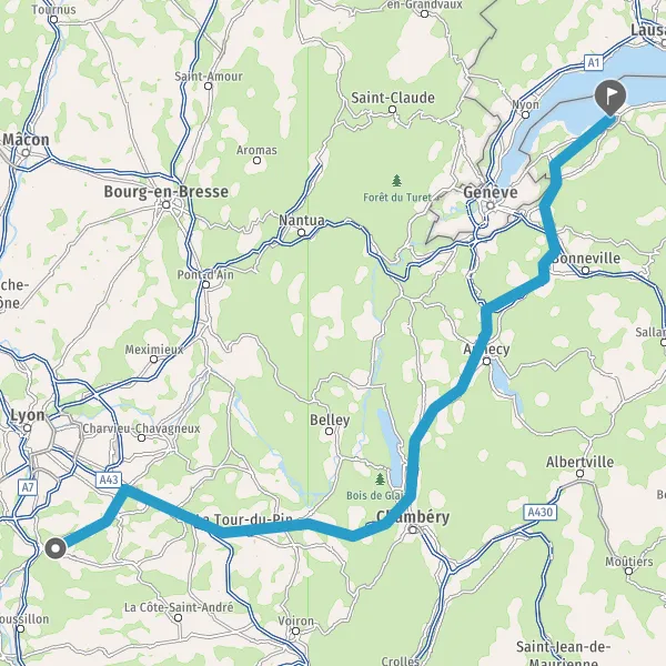 Prendre à droite et rejoindre A43 E711 E70. Continuer sur 21 kilomètres