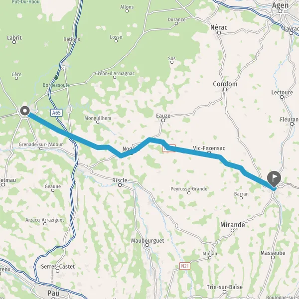 Au rond-point, prendre la 2ème sortie sur D30 (Avenue du Houga) et continuer sur 22 kilomètres
