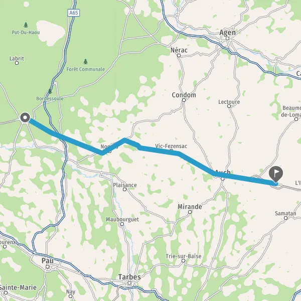 Au rond-point, prendre la 2ème sortie sur D30 (Avenue du Houga) et continuer sur 22 kilomètres