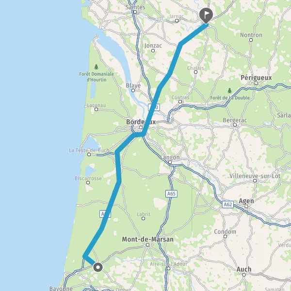 Prendre à droite et rejoindre A63 E5 E70. Continuer sur 130 kilomètres