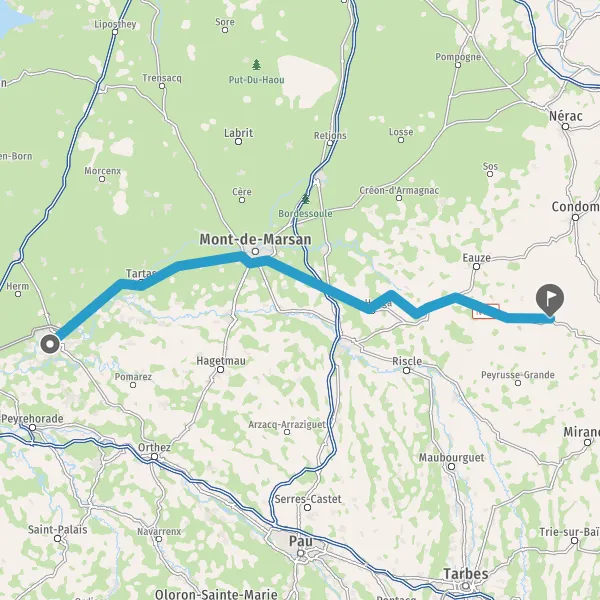 Au rond-point, prendre la 1ère sortie sur D30 (Avenue du Houga) et continuer sur 22 kilomètres