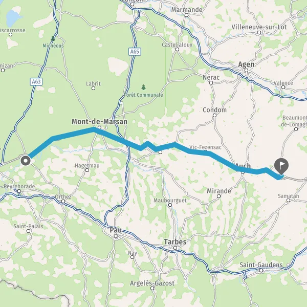Au rond-point, prendre la 1ère sortie sur D30 (Avenue du Houga) et continuer sur 22 kilomètres